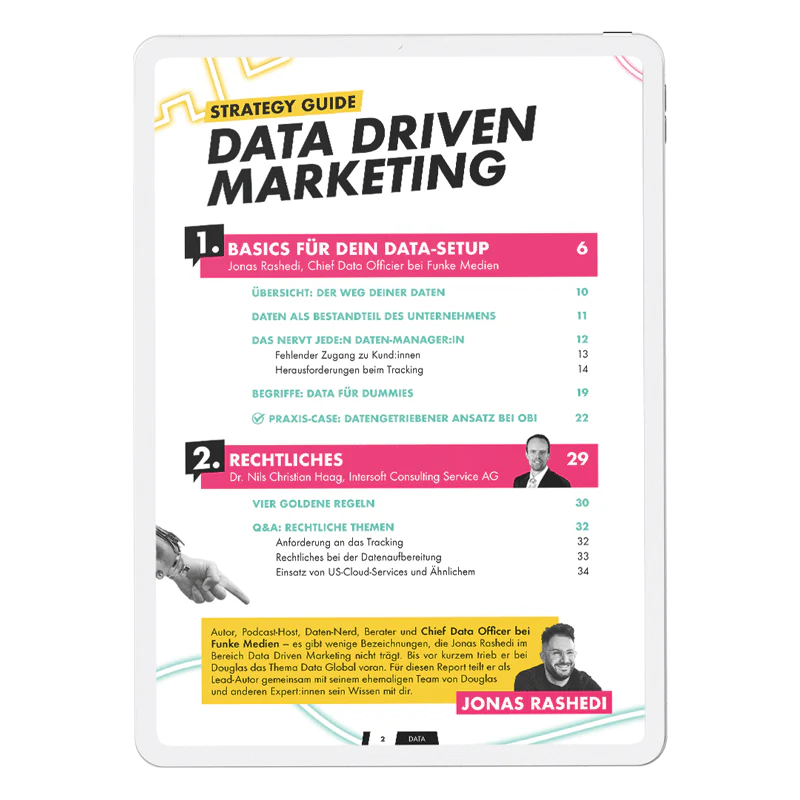 In diesem Strategy Guide profitierst du von der langjährigen Erfahrung unserer Expert*innen. Lead-Autor Jonas Rashedi, Chief Data Officer bei Funke Medien, ist seit Jahren in der Welt der Daten unterwegs und berät selbst zahlreiche Kund*innen. Mit ihm zusammen hat das Daten-Team von Douglas an diesem Report gearbeitet, die über Jahre hinweg ein Profi-Setup für das Data Driven Marketing aufgebaut haben. Und damit du dich auch juristisch in sicherem Fahrwasser bewegst, ist unser Rechtsanwalt und Datenschutzexperte Dr. Nils Christian Haag mit an Bord.