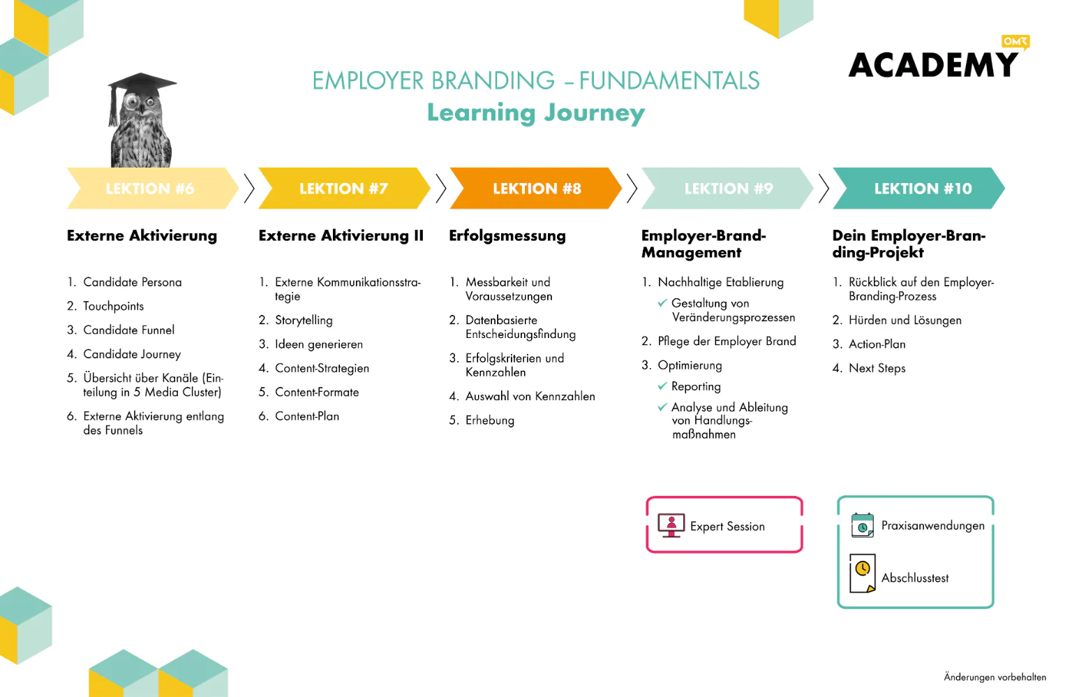 Werde zur*m erfolgreichen Employer Brand Manager*in und lerne in diesem E-Learning-Kurs, wie du ein Unternehmen authentisch und attraktiv auf dem Arbeitsmarkt positionierst, die Effekte und Wirkung von Employer Branding messbar machst und gegenüber dem Management vertrittst. Für alle, die lernen wollen, was wirklich hinter dem Buzzword steckt.