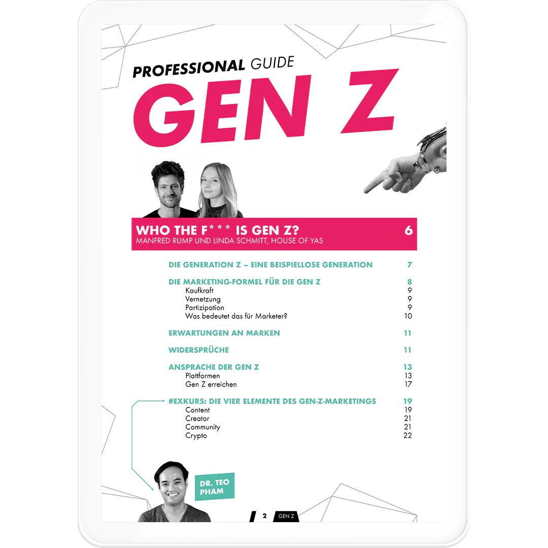Dieser Guide ist nicht bloß „ein Blick von außen“ auf die Generation Z. Er beleuchtet sie von innen. Im Report kommen die besten Expert*innen zu Wort, die sich tagtäglich mit der jungen Zielgruppe beschäftigen – ob als Marketing-Pro bei Odaline oder House of Yas, als Creator wie Sven Oechler oder als Personalerin und HR-Expertin wie Eva Stock.